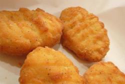 cartilagens e outras sobras da galinha moídas e misturadas. Tudo isso frito com